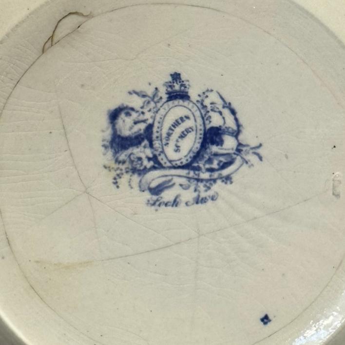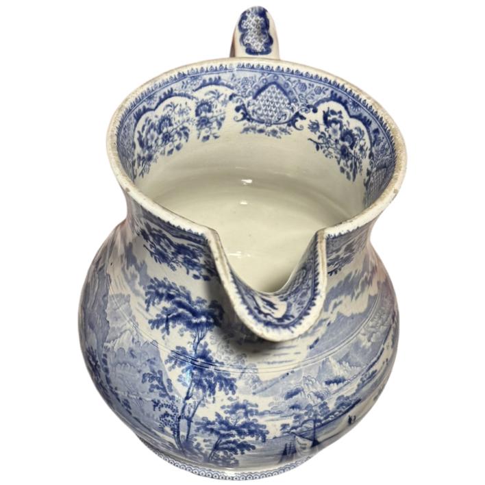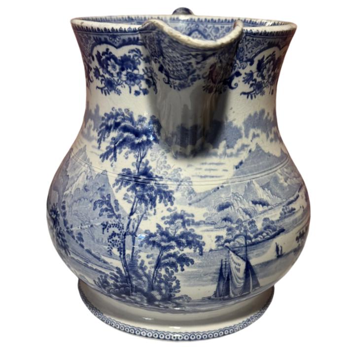 An early 19th century English blue and white pottery water jug in Northern Scenery Loch Awe pattern, circa 1810