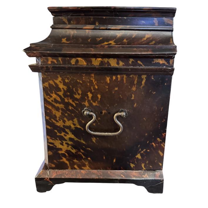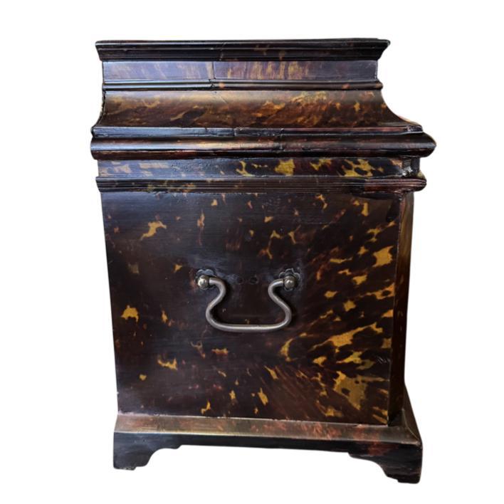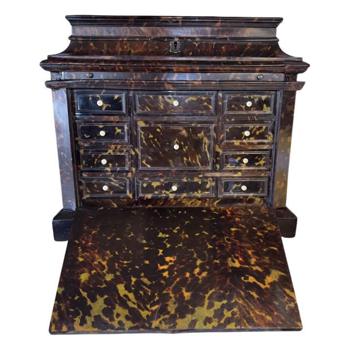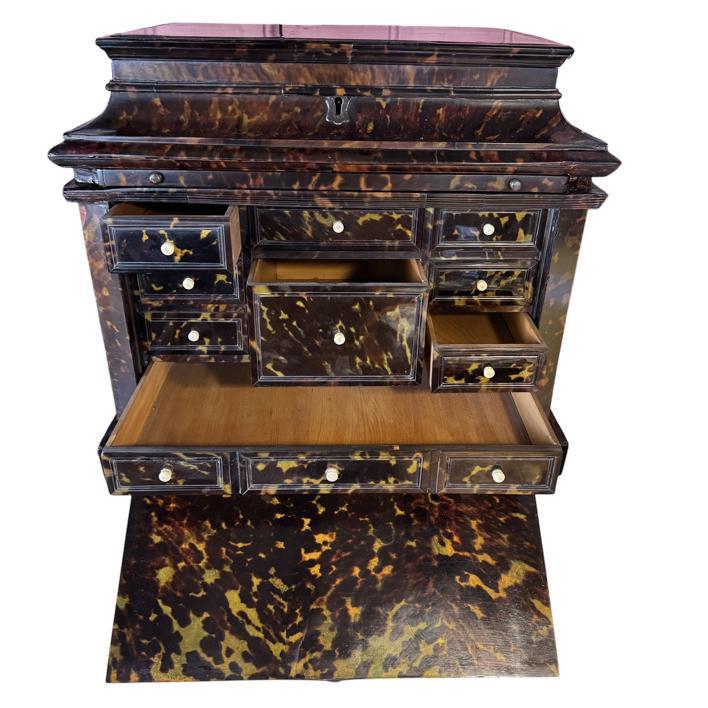 A fine and rare 17th century tortoiseshell veneered table cabinet with hinged top revealing a mirror and parquetry interior over a drop front opening to reveal a bank of drawers on bracket feet with white metal handles, circa 1680.