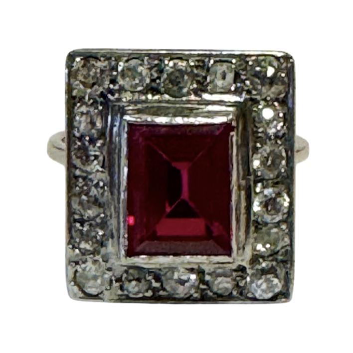 Circa 1925 French platinum Art Deco table cut ruby and diamond plaque ring.