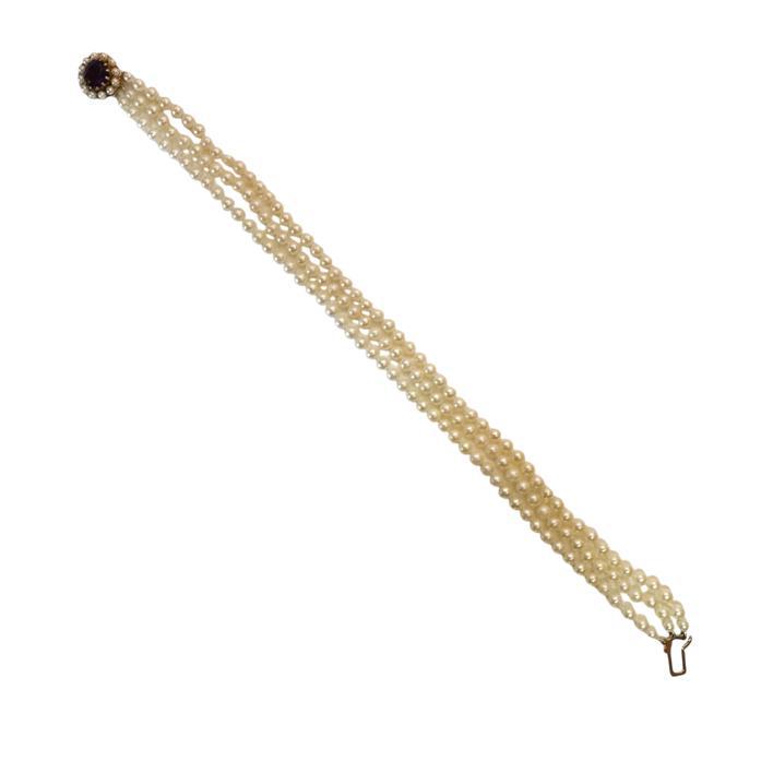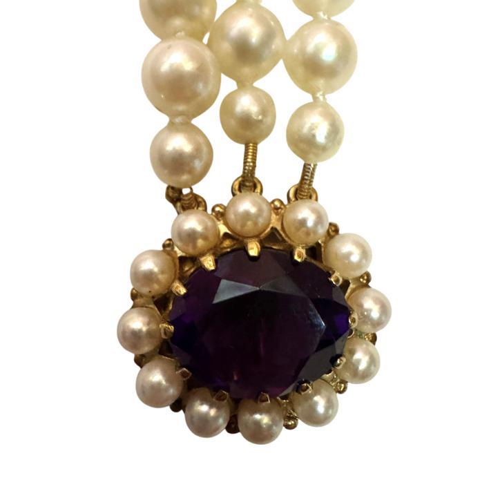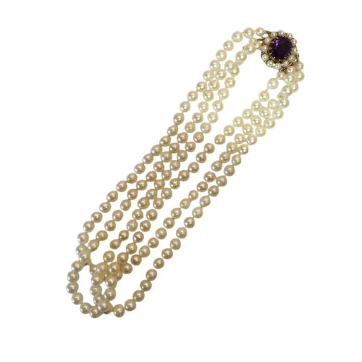 A triple stand cultured pearl choker necklace with a yellow gold, amethyst and pearl clasp.