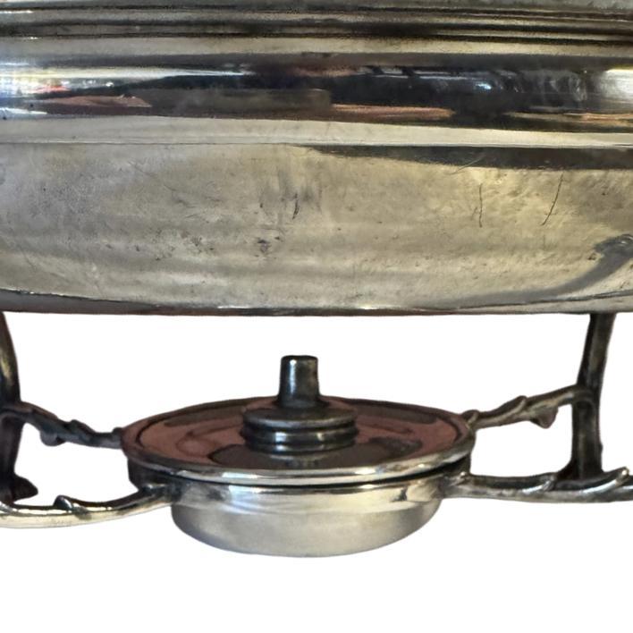 A Victorian silver plate oval tiffin dish on a stand with spirit burner circa 1860