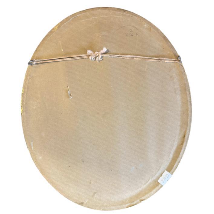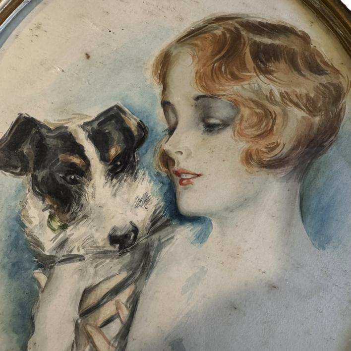 Marjorie Lazarus, 1926, art deco oval gilt framed water colour portrait of a young lady and her dog.