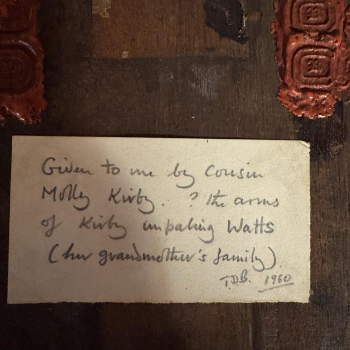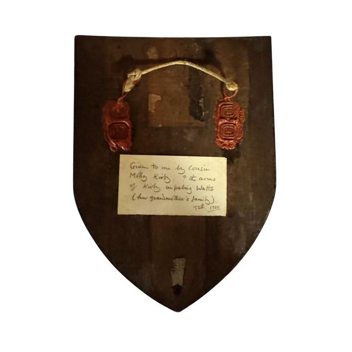 A hand painted boxwood coat of arms for the Kirby Watts family, circa 1950