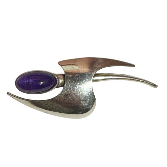 N E From Danish silver comet brooch set with an oval cabochon amethyst, circa 1955