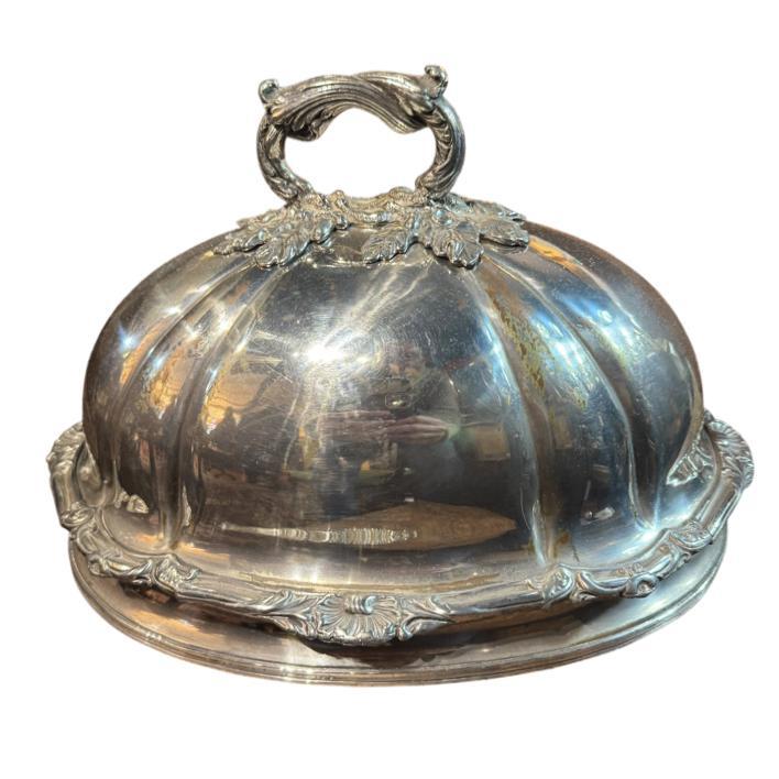 An early 19th century Old Sheffield Plate dish cloche with Rococo handle and borders, circa 1810