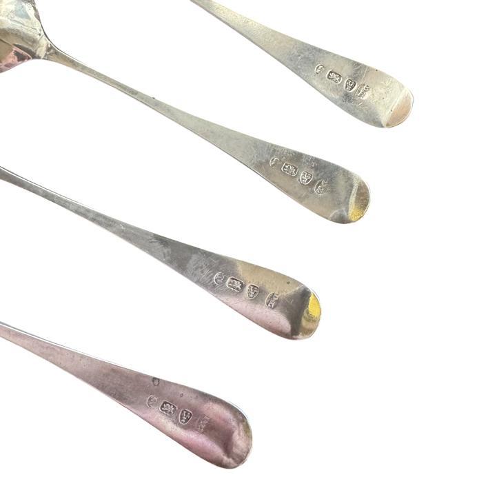 A set of four Georgian silver tea spoons by Dorothy Langlands circa 1810. Makers and Newcastle assay office marks. Each engraved with the initials MV.